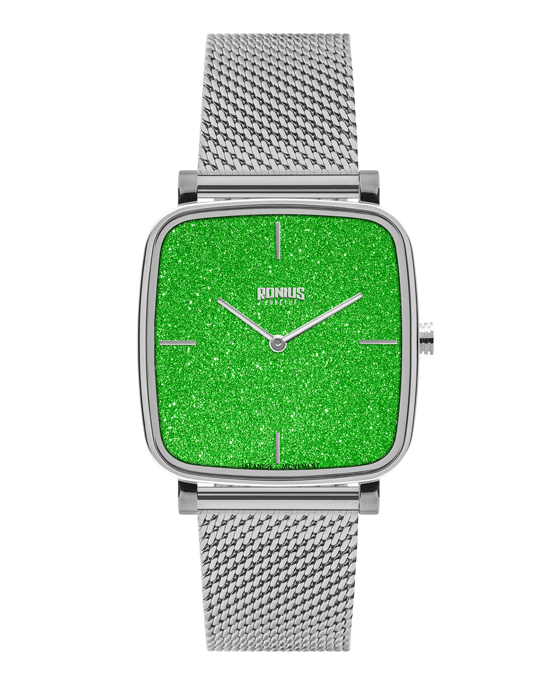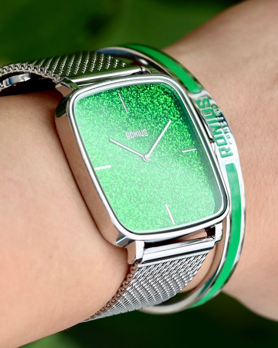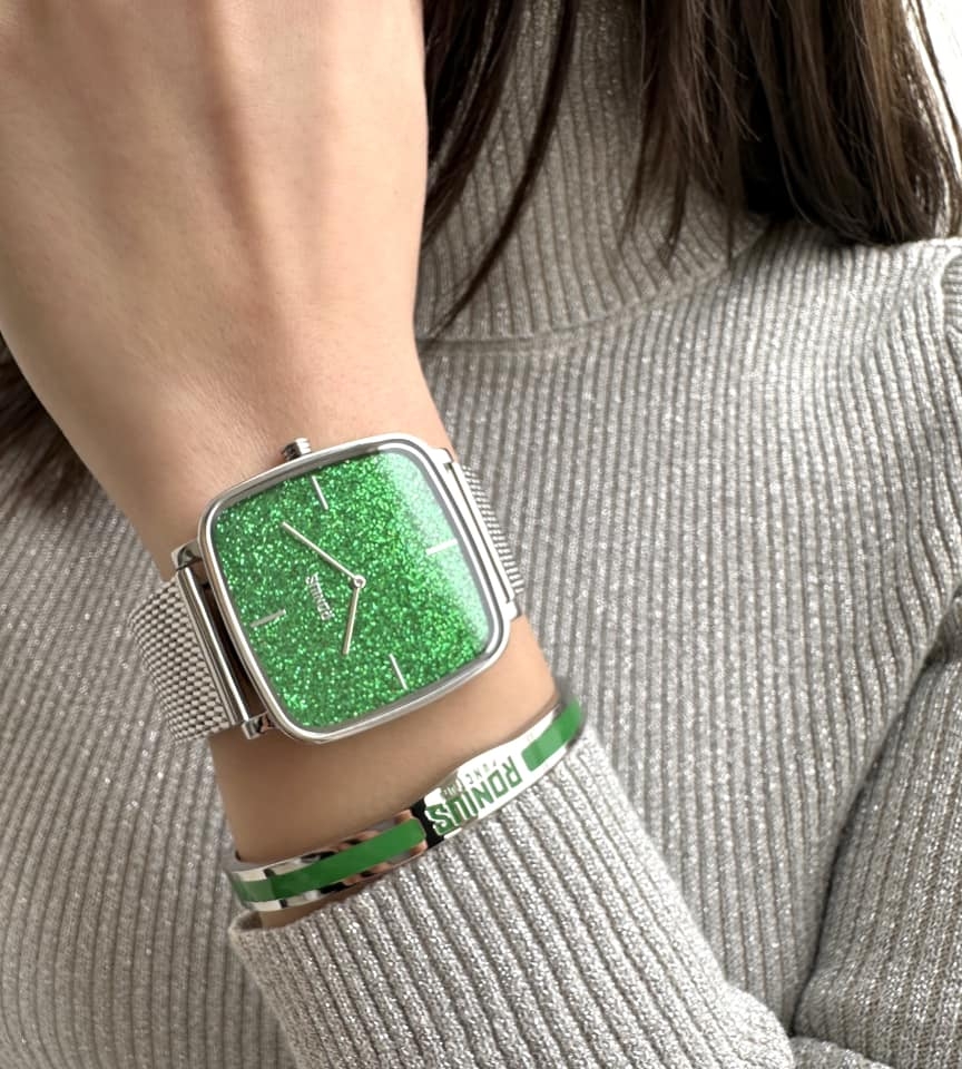 Sparkles Green conveys energy and freshness: the green glitter dial catches the light with a bright, dynamic effect, paired with a sleek stainless-steel case and bracelet. A model designed for those who love to stand out with elegance.