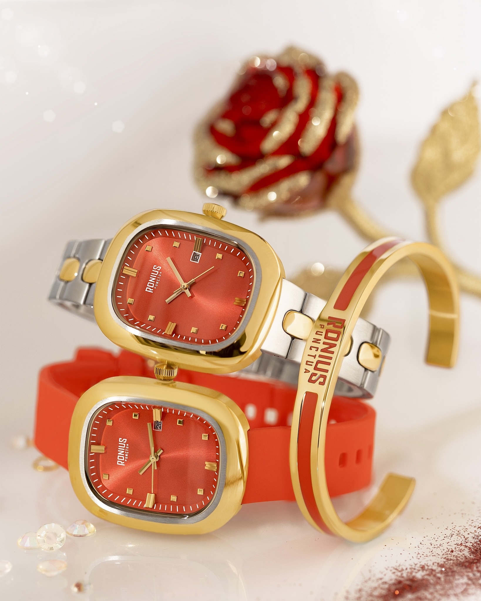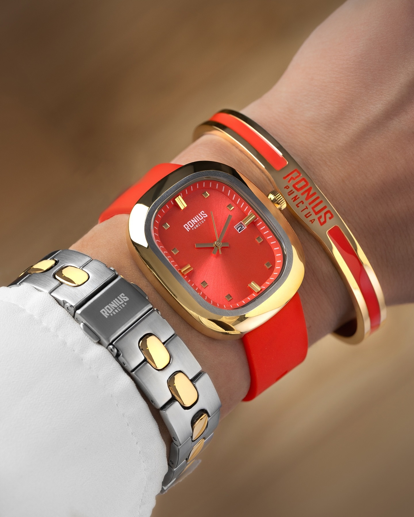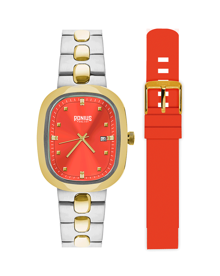 A bold and radiant model designed for those who love to stand out. The vibrant red dial instantly draws attention, while the gold case and two-tone bracelet balance character and elegance. Paired with its matching silicone strap, this timepiece adds energy, style, and personality to every moment.