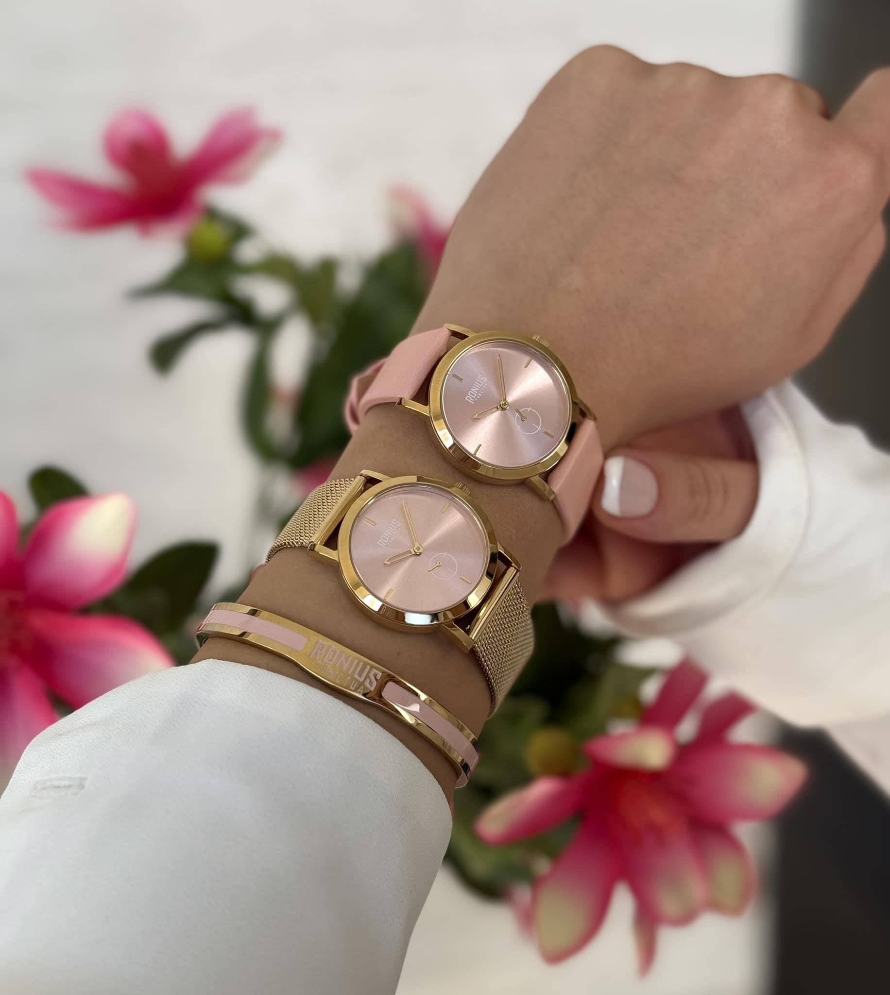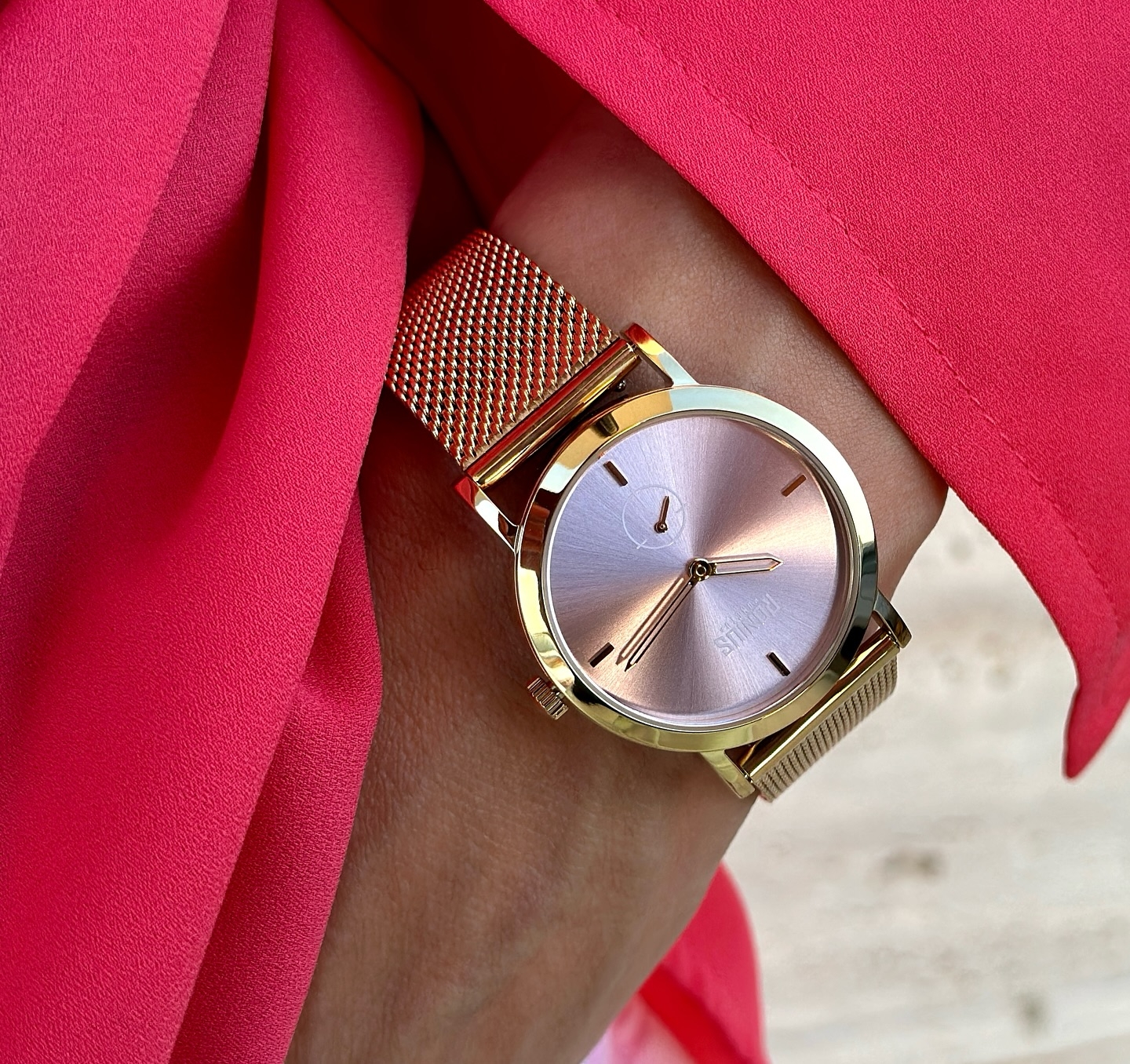 A warm glow to wear every day. The Sunshine model combines the elegance of the gold mesh strap with a soft, satin-finish dial, creating a timepiece that shines with subtle beauty. Clean lines and a minimalist design make it perfect for those who appreciate a feminine, radiant, and timeless style. An accessory that brightens any outfit with grace and ease.