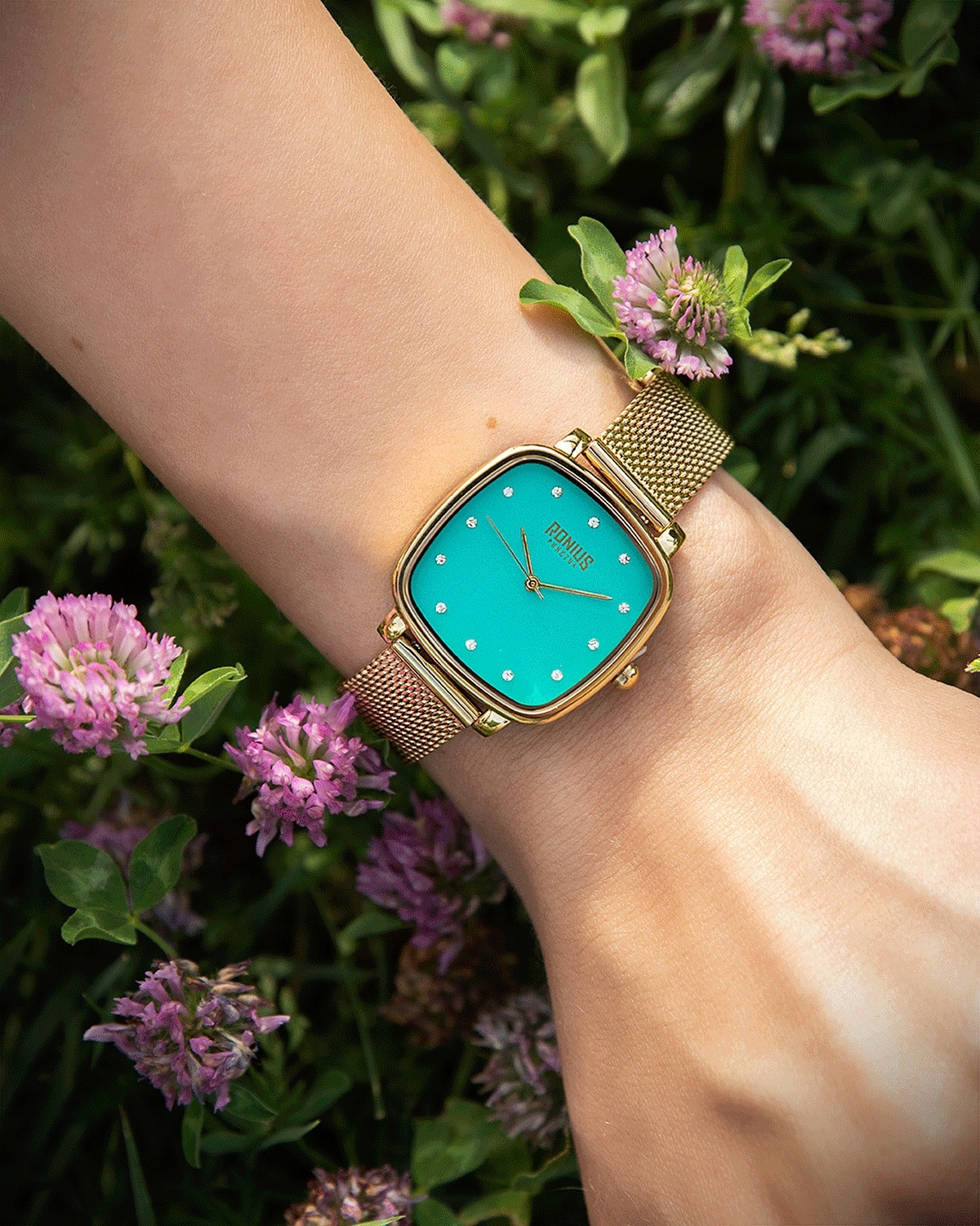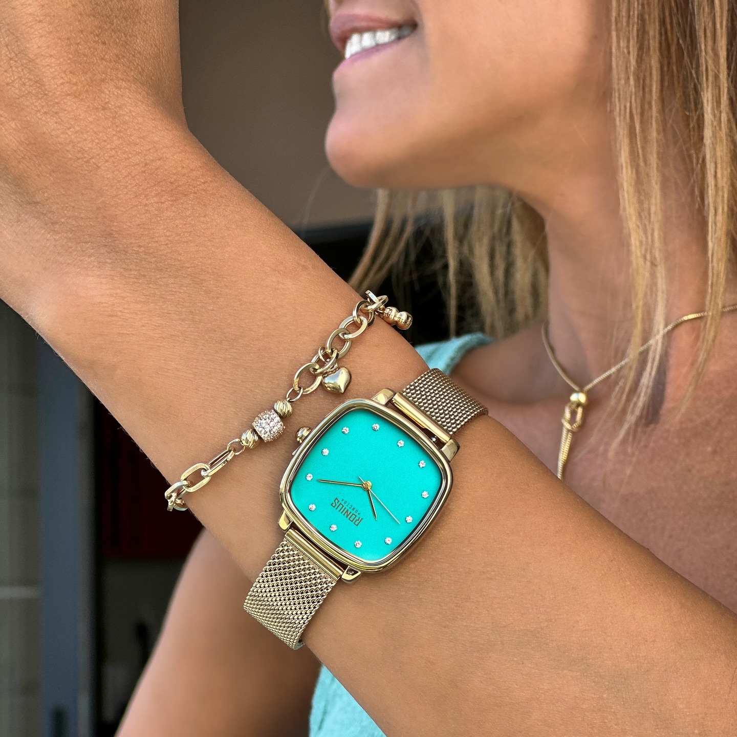 Vibrant and refined, the Frost Aqua Crystal combines a bright turquoise dial with sparkling stones, enhanced by a gold case and gold mesh bracelet. A fresh yet sophisticated piece, ideal for those who want elegance with a lively touch.