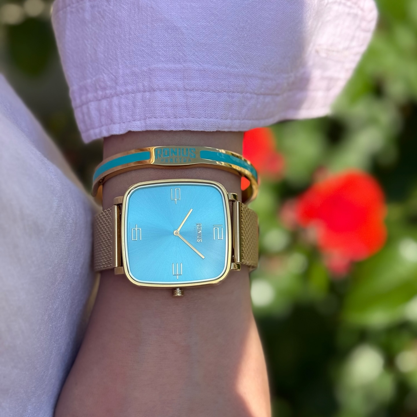 A burst of freshness: the turquoise dial catches the light with vibrant reflections, enhanced by the brushed gold case and bracelet. Elegant and bright, it's the perfect choice for those who love to stand out with style.