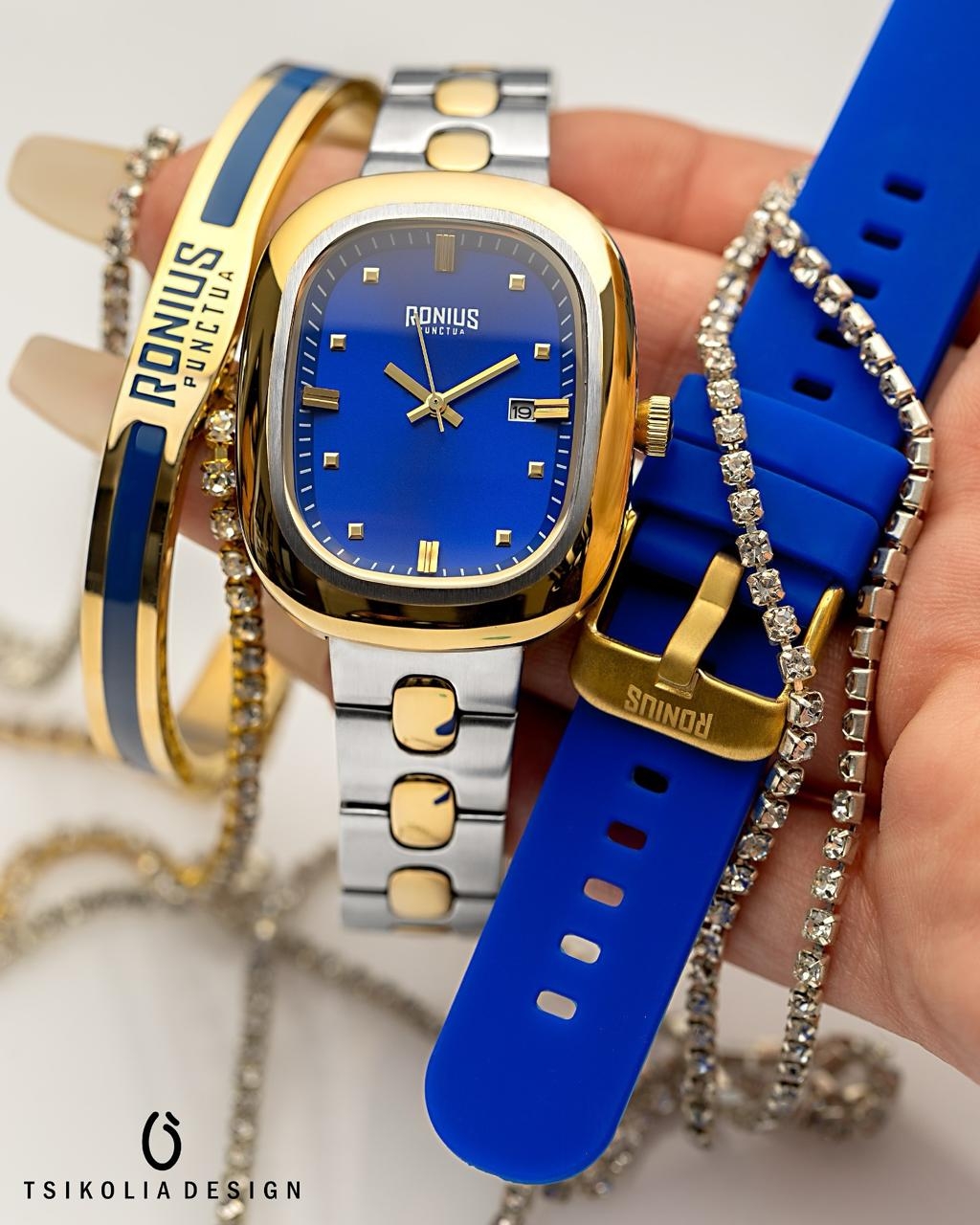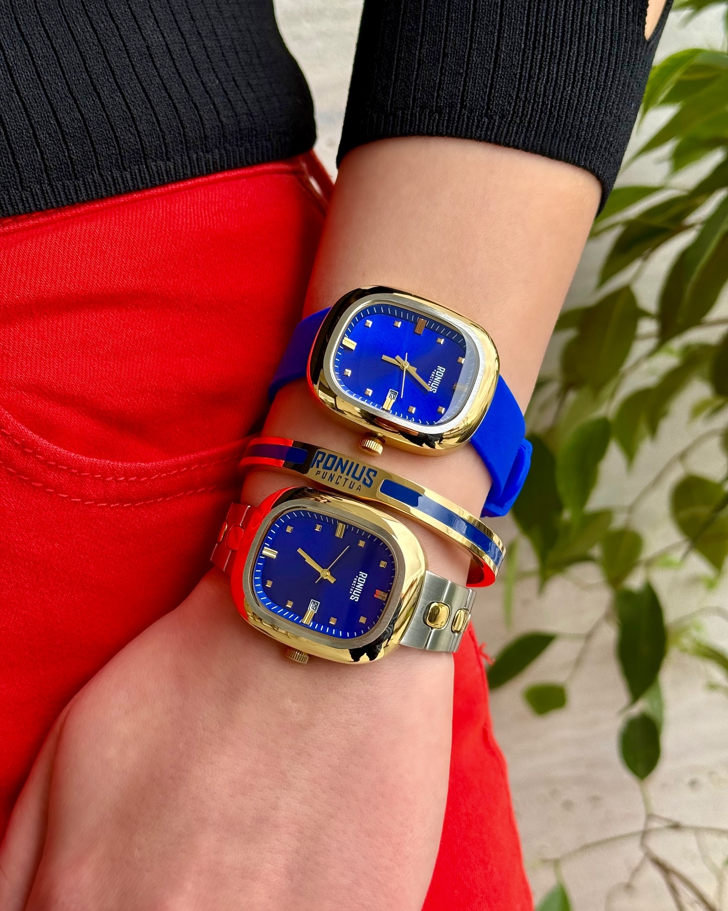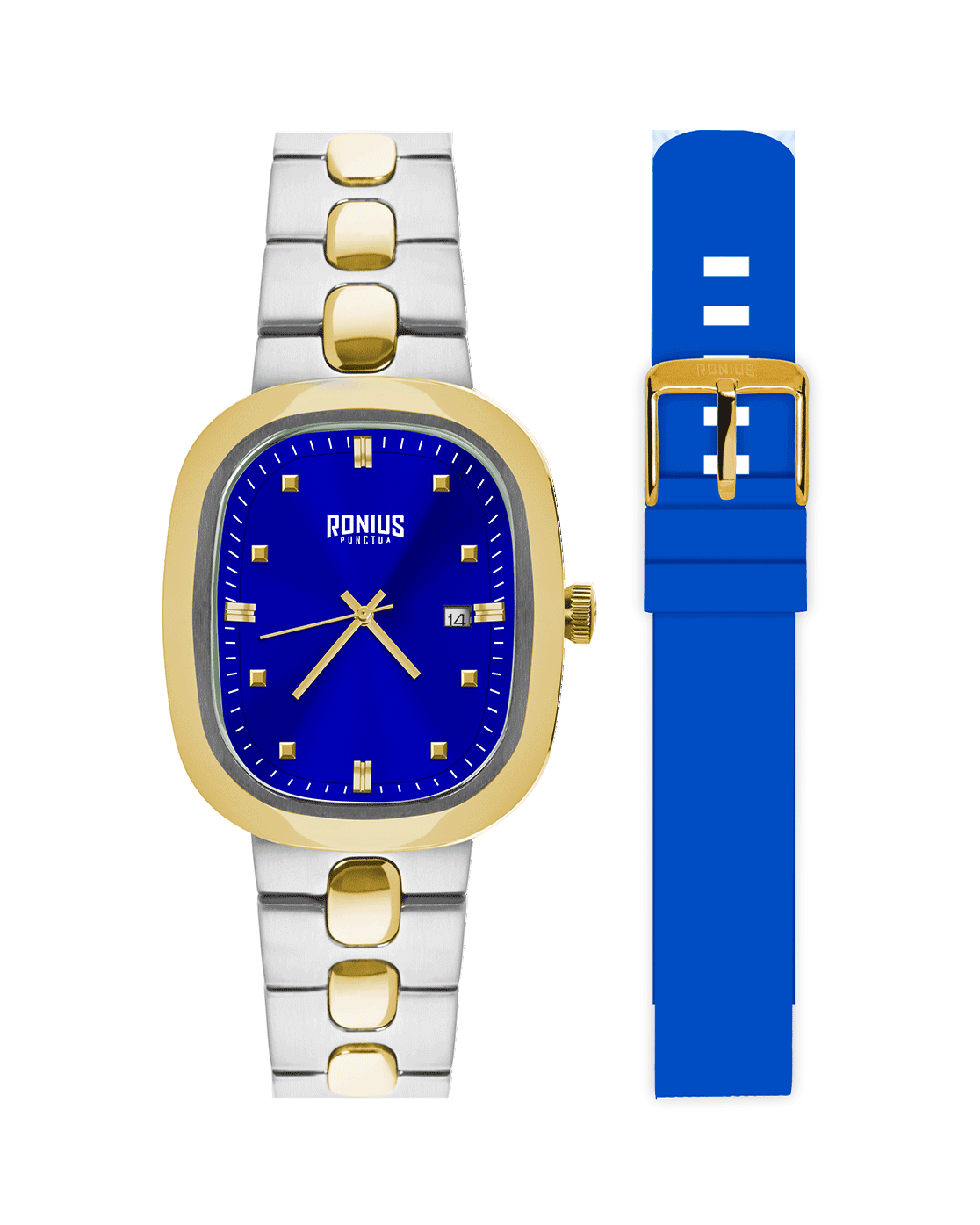 Intense, elegant, and timeless. The deep blue dial enhances the gold case and two-tone bracelet, creating a sophisticated and bold contrast. Paired with its matching silicone strap, this model combines style, versatility, and a striking presence.