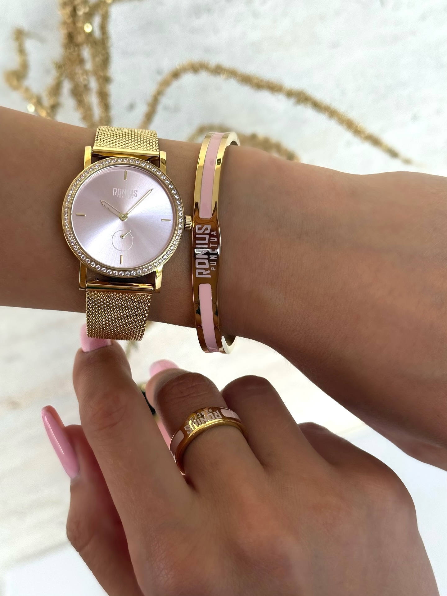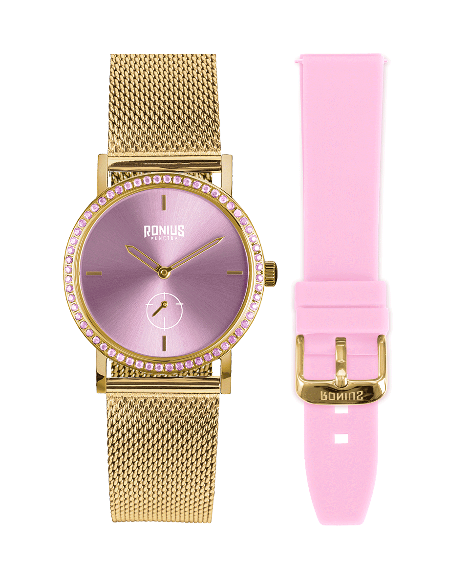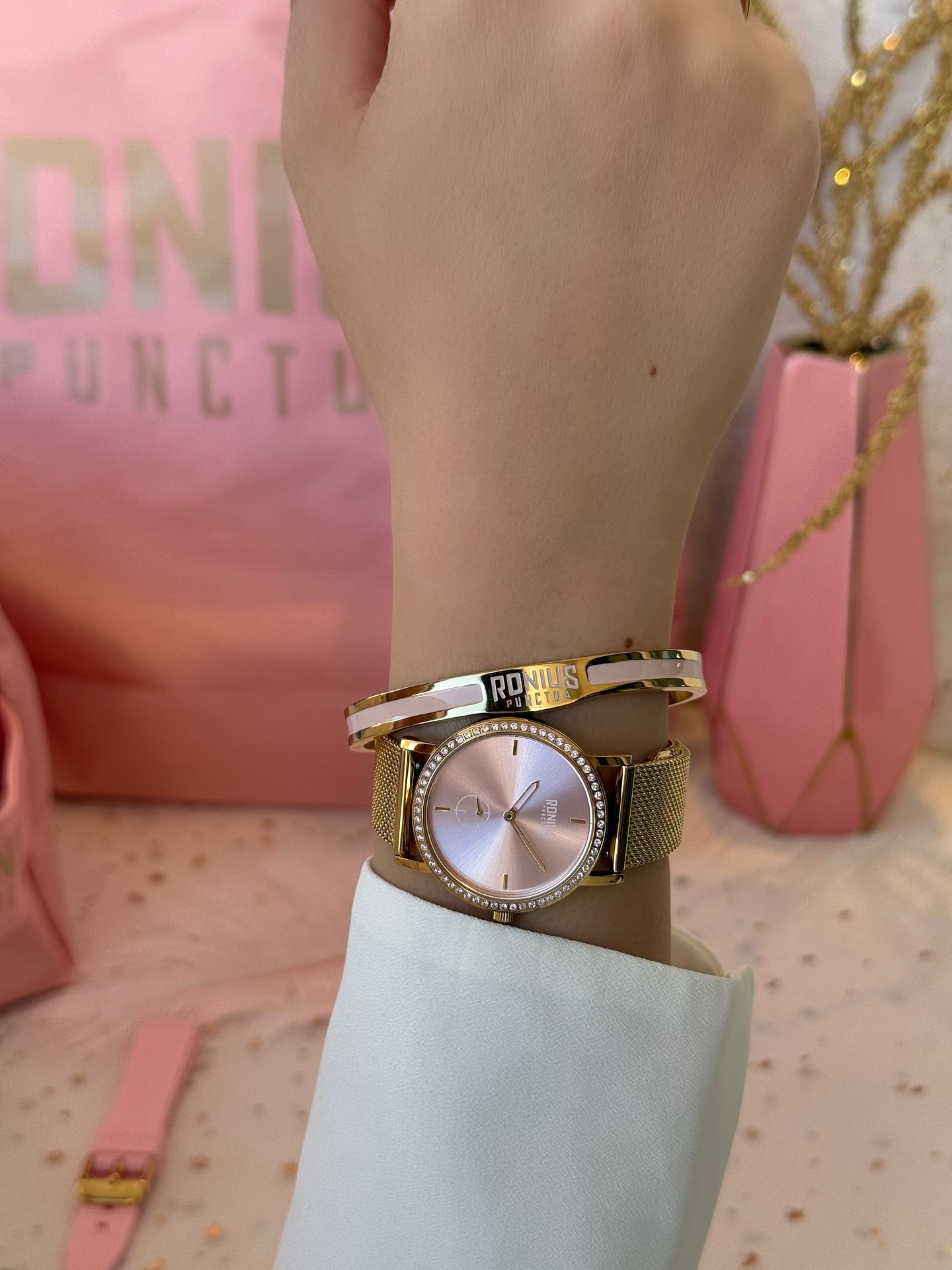 A radiant elegance that stands out. The Sunshine Stones Edition enriches the classic design of the collection with a sparkling crystal bezel. The soft, satin-finish dial is paired with a ring of shimmering stones that catch the light with every movement. The gold mesh strap completes the look, making this model the perfect choice for those who appreciate a refined, feminine, and luminous style.