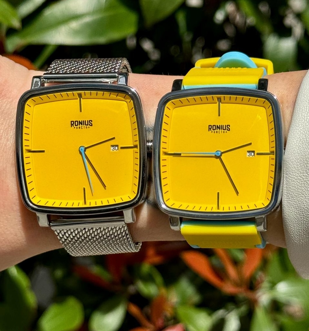 Its bright yellow dial contrasts beautifully with the turquoise seconds hand, while the slim markers create a clean, refined look.