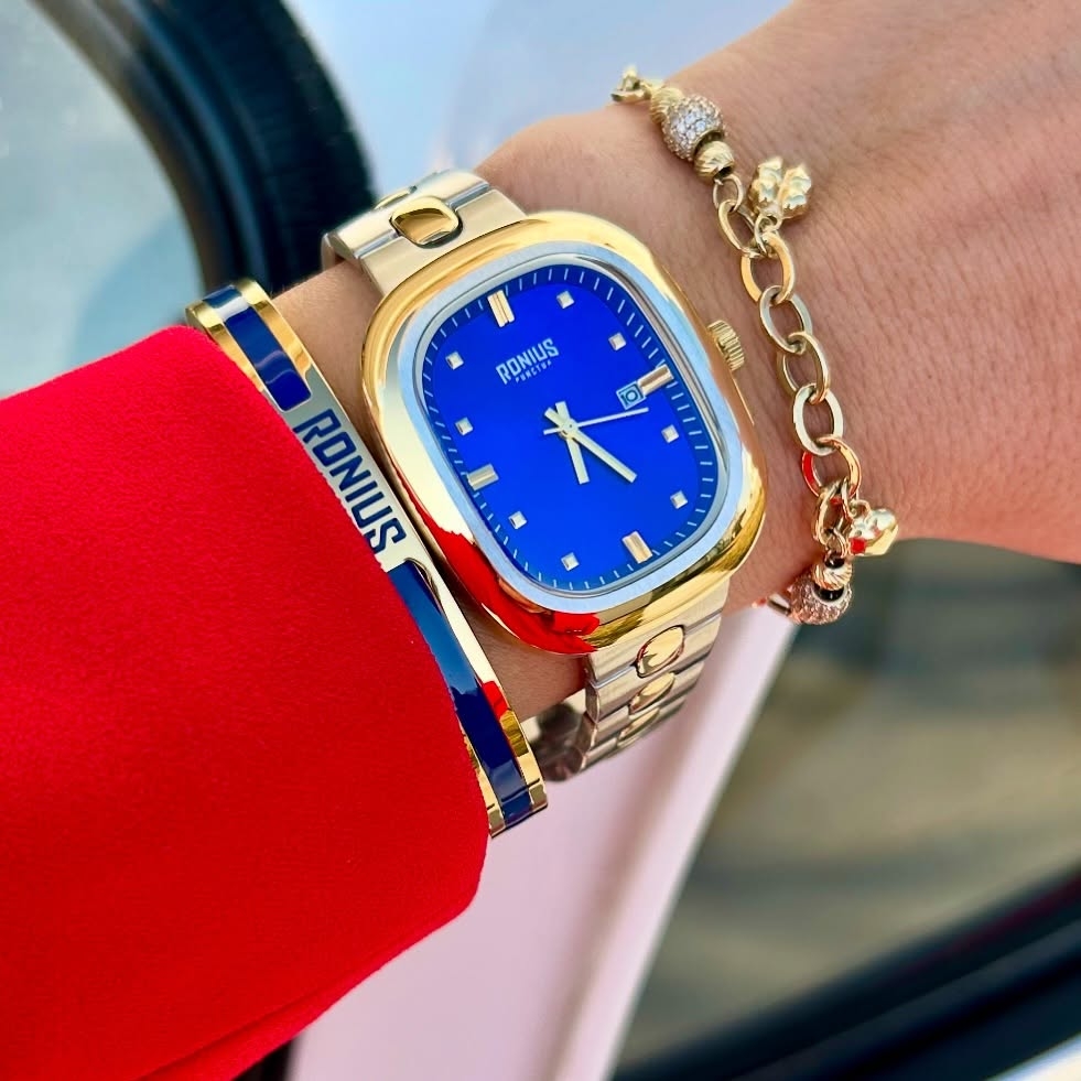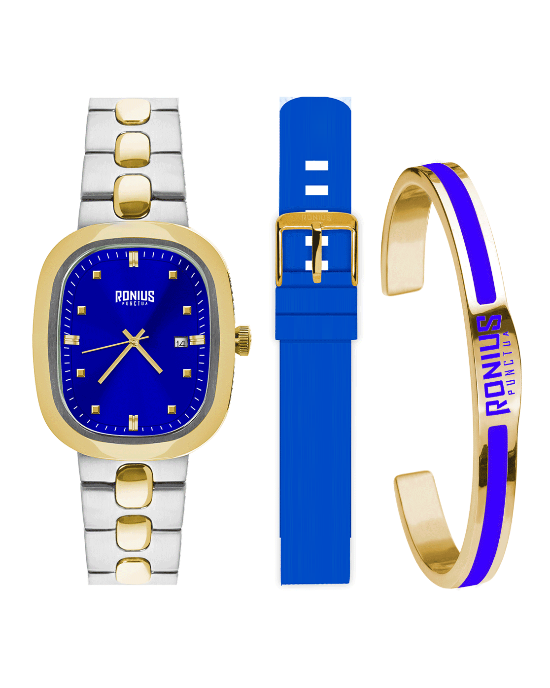 Intense, elegant, and timeless. The deep blue dial enhances the gold case and two-tone bracelet, creating a sophisticated and bold contrast. Paired with its matching silicone strap, this model combines style, versatility, and a striking presence.